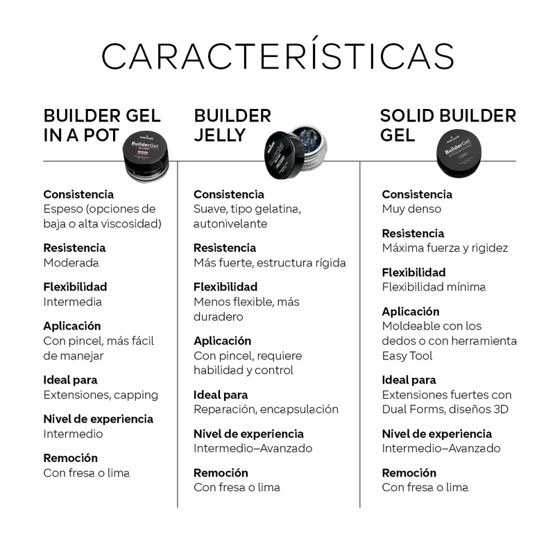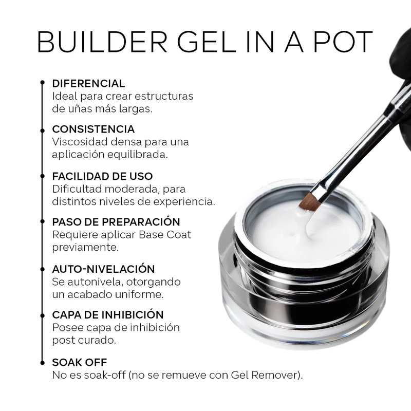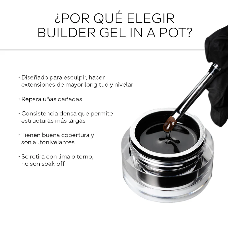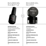 Builder Gel es un producto pensado fundamentalmente para esculpir, pero también sirve para nivelar, reparar uñas dañadas o realizar capping sin limado. Poseen una consistencia más densa que los Builder Gel in a Bottle, lo que permite generar estructuras de mayor longitud. Así también, cuentan con un pigmento con bastante cobertura, son autonivelables y low viscosity. Su nuevo envase permite mayor practicidad en su aplicación.