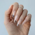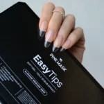 Colocar el tip 45 grados con respecto a la uña natural e ir bajándolo suavemente desde la cutícula hasta llegar a cubrir el borde libre.